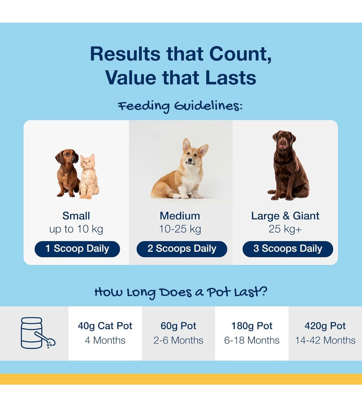 Great value for money and can last up to 6 months (smaller dogs/cats). Easy to use, just sprinkle on food daily.
