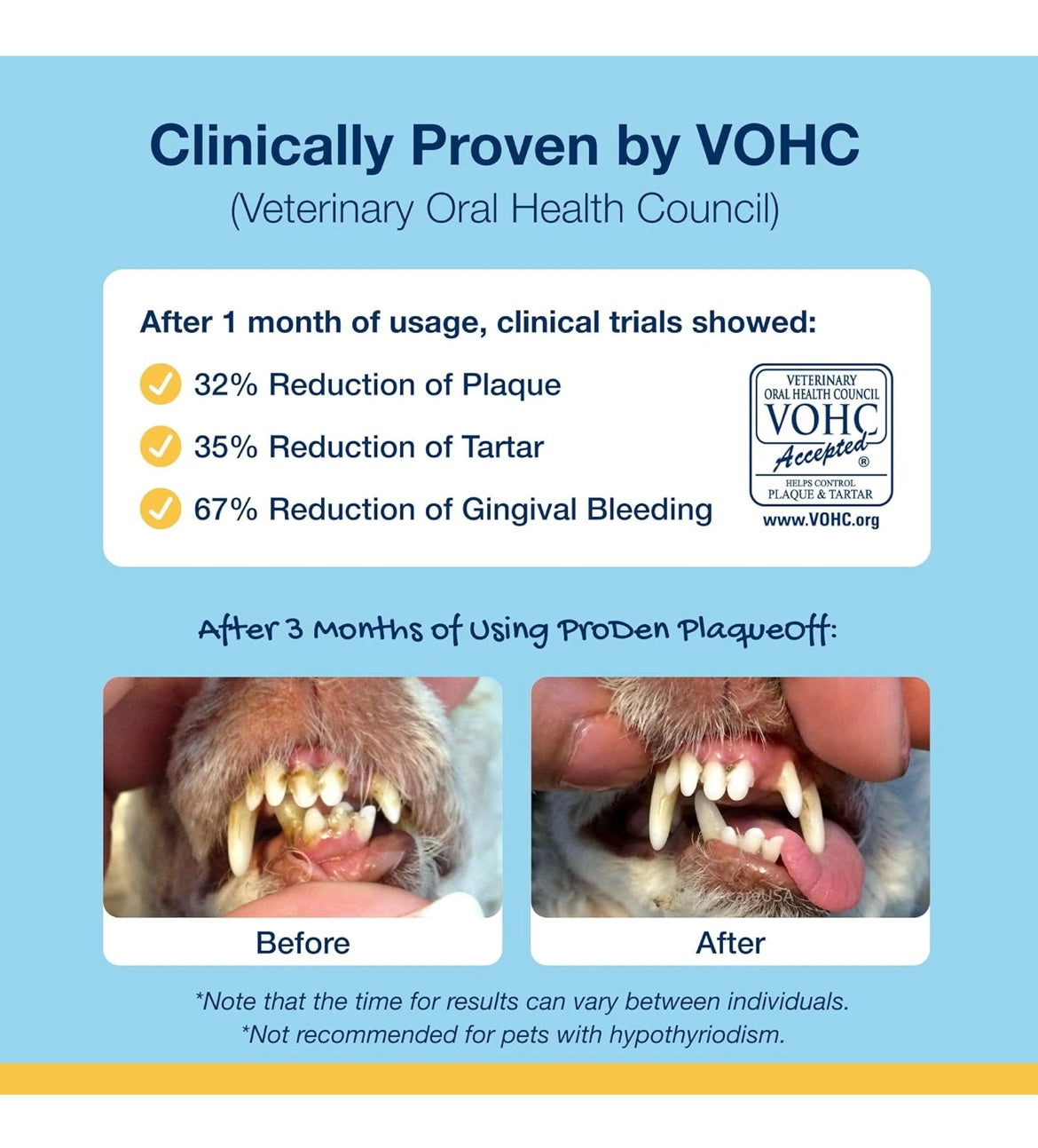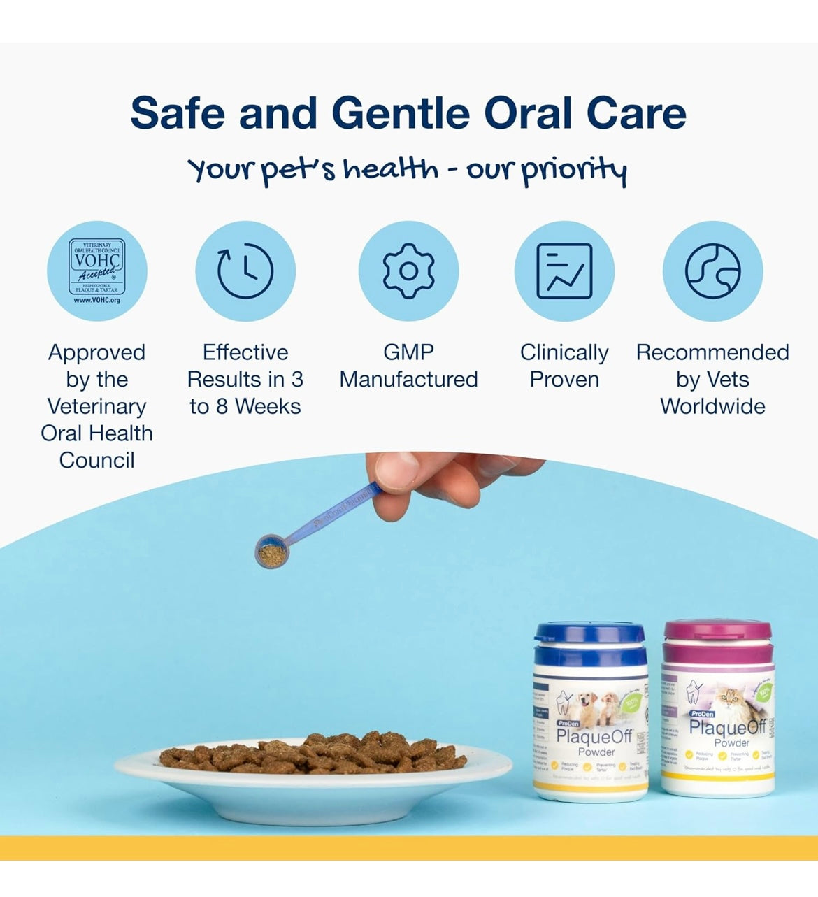 PlaqueOff Powder for dogs and cats is a natural seaweed plaque remover for teeth, recommended by vets and accepted by the VOHC (Veterinary Oral Health Council).