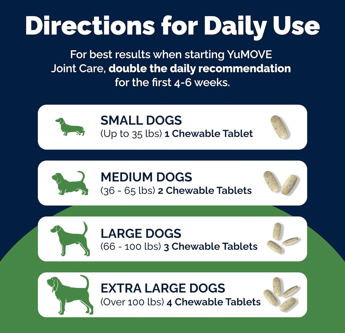 YuMOVE Joint Care for Adult Dogs is our original triple-action dog joint formulation, recommended for adult dogs who are beginning to show signs of joint stiffness. YuMOVE Joint Care for Adult Dogs provides a special blend of Omega-3s to help soothe stiff joints and aid mobility.